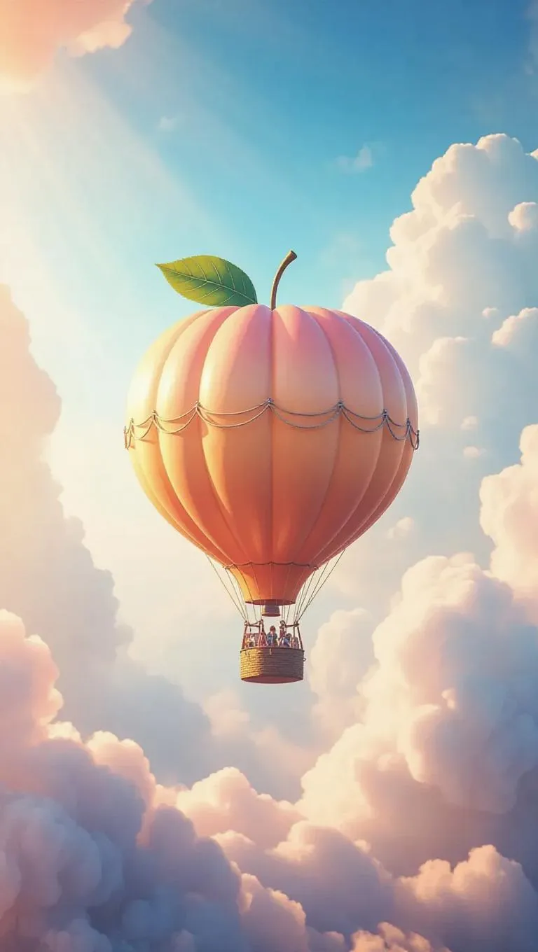 A whimsical peach-shaped blimp gently sailing through dreamy candy-colored skies, carrying joyful explorers. The blimp's vibrant hue contrasts with the delicate, whipped-cream clouds, creating a surreal and delightful atmosphere. Sunbeams filter through, casting a soft, ethereal glow that enhances the enchanting trip.