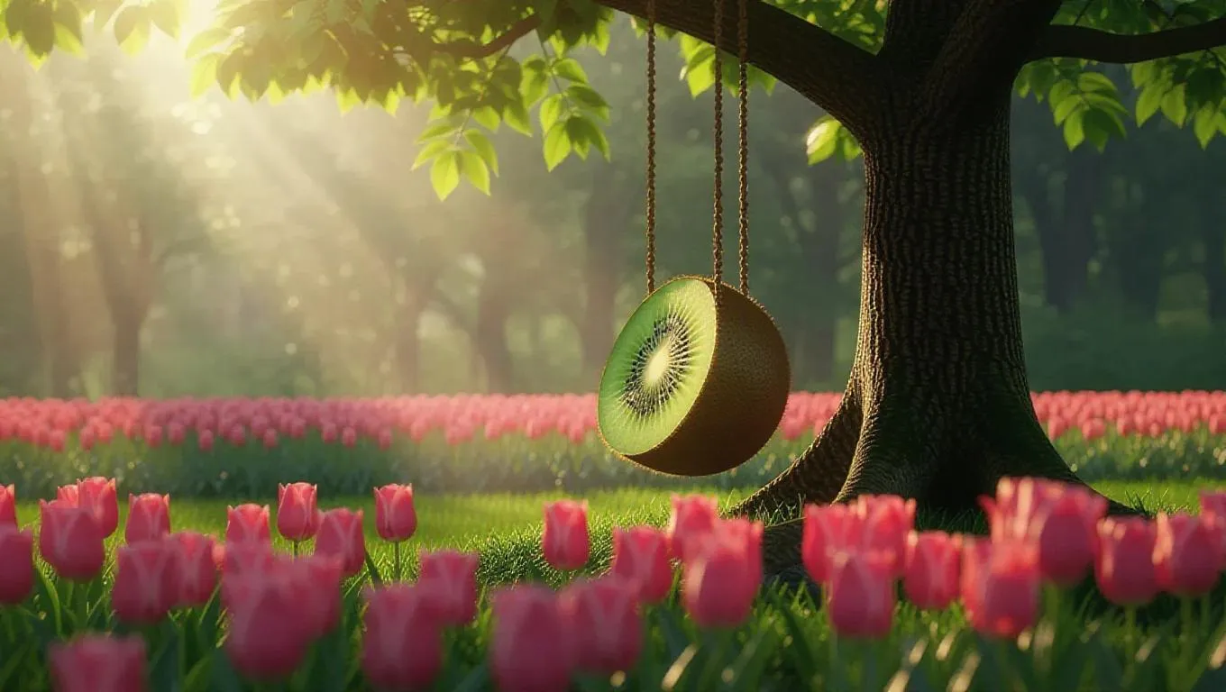 A whimsical half-kiwi-shaped swing hanging from a modern cherry tree, surrounded by a vibrant meadow of tulips in full bloom, creating a magical and serene atmosphere, with soft sunlight filtering through the leaves, casting dappled shadows.