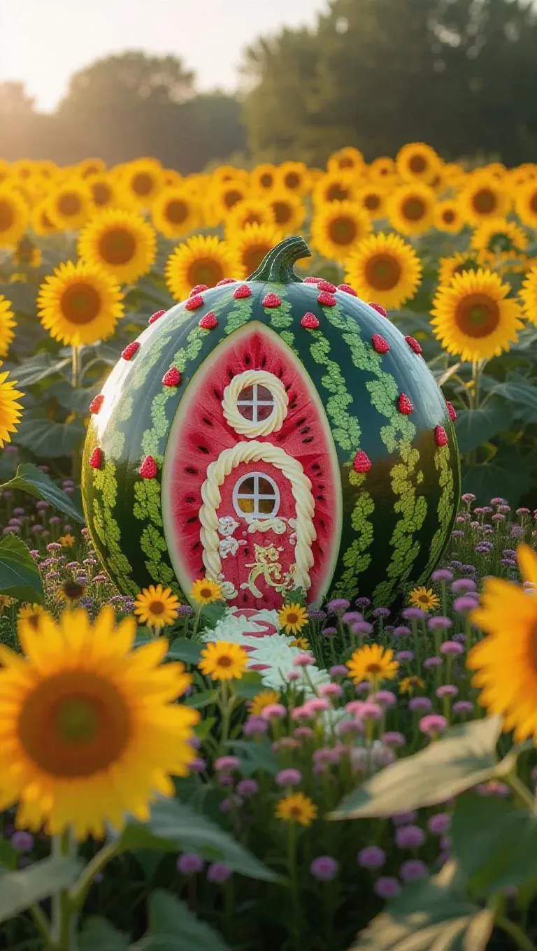 A whimsical little cottage crafted from plump watermelons and creamy frosting, nestled in the heart of a vibrant sunflower field, surrounded by a sea of golden sunflowers and delicate wildflowers, exuding a sweet, enchanting aroma under the bright light of a sunny day.