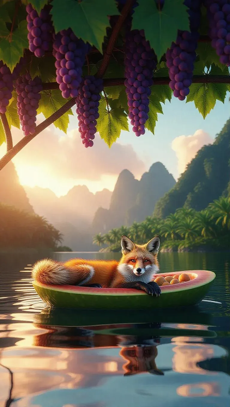 A fox lounges comfortably under a lush grapevine umbrella on a whimsical floating papaya raft, surrounded by still, pristine waters, with lush tropical mountains in the distance and a gentle sunset casting a warm, golden glow