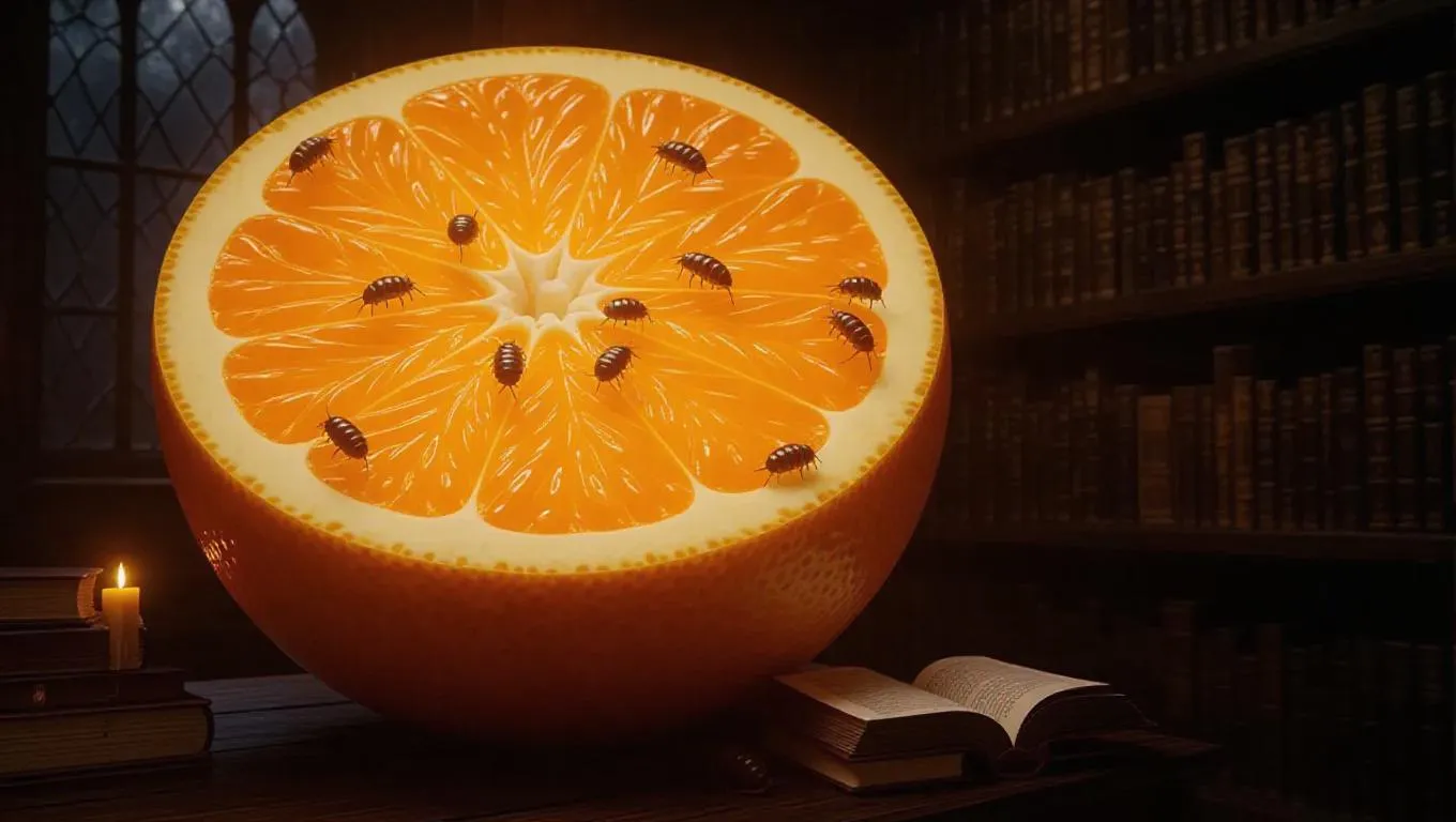 A mystical library nestled within a colossal orange peel, illuminated by glowing fruit scrolls that emit a soft, ethereal light. Flying bookworms sip nectar from the scrolls, creating a whimsical and enchanting atmosphere. The walls are lined with ancient tomes and intricate carvings, enhancing the magical ambiance.