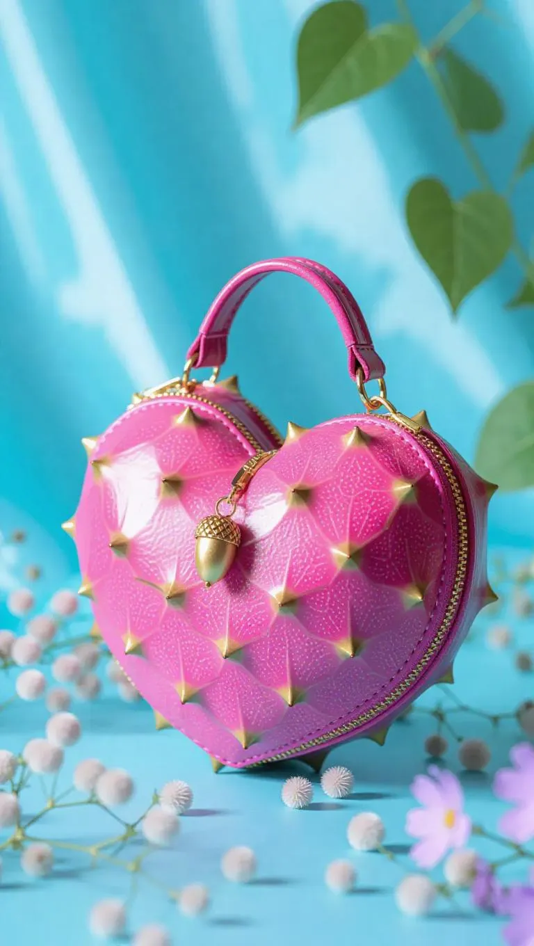 A heart-shaped dragonfruit handbag with golden zippers and a tiny acorn charm, exuding a whimsical charm, set against a baby blue backdrop, with delicate seed patterns and soft, dreamy lighting.