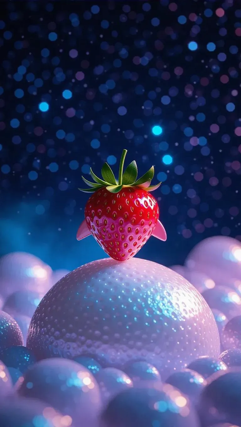 A playful strawberry-shaped spaceship gently landing on an iridescent, pearl moon, surrounded by a shower of sparkling stars, with a bright, azure sky creating a dreamy, radiant atmosphere.