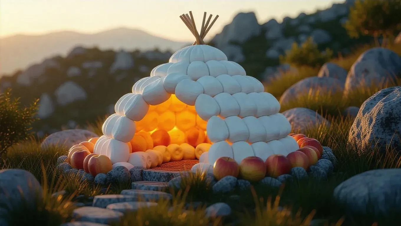 A whimsical little yurt crafted from luscious nectarines and light marshmallow fluff, nestled in the heart of a rocky hillside, surrounded by a sea of shimmering stones and sprouting grass, exuding a sweet, enchanting aroma during the vibrant sunset.