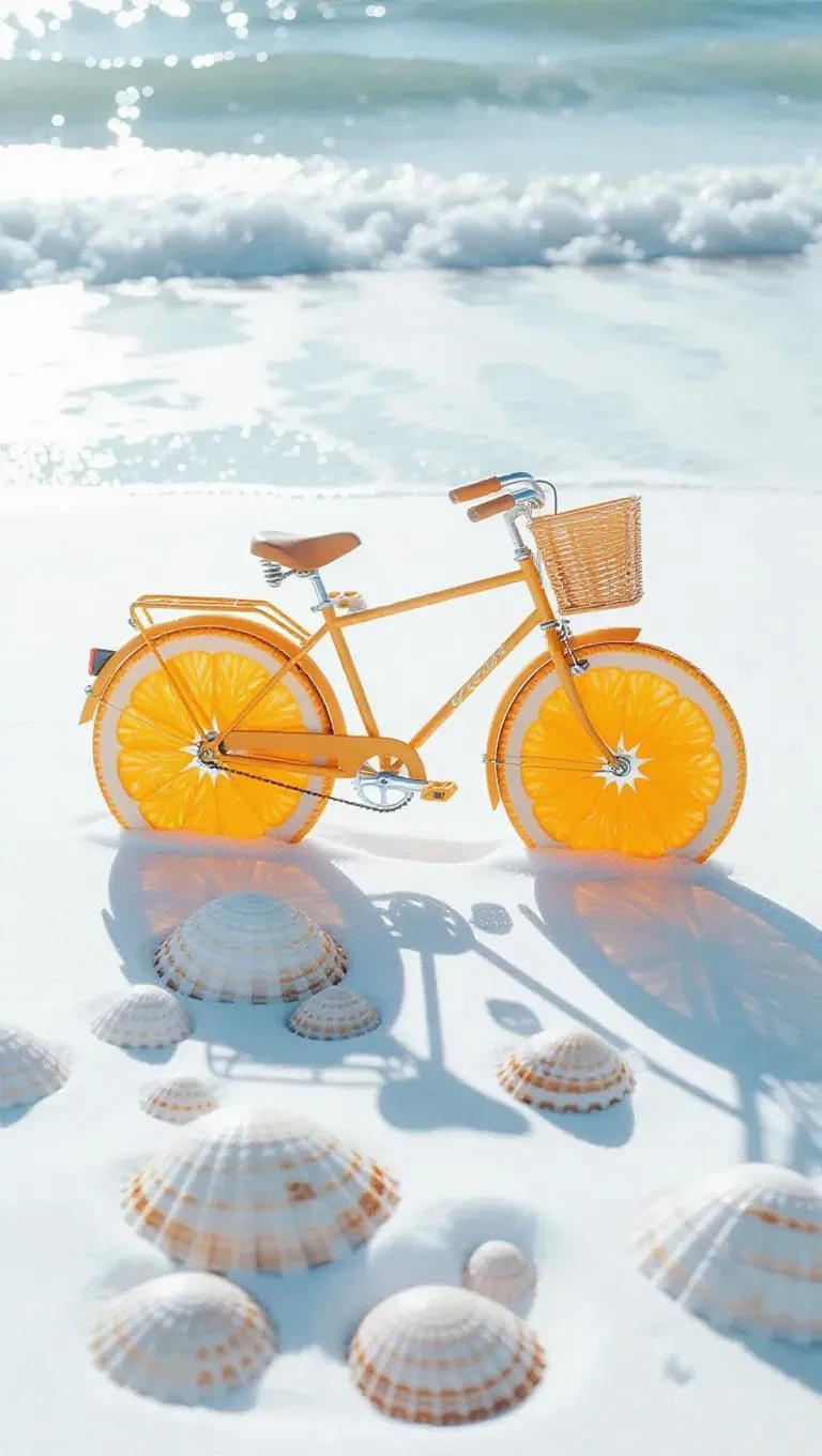 A whimsical bicycle with wheels shaped like juicy orange slices, standing on a snowy beach, surrounded by icy waves and frozen seashells, casting a playful shadow on the white sand, exuding a sense of winter joy and creativity.