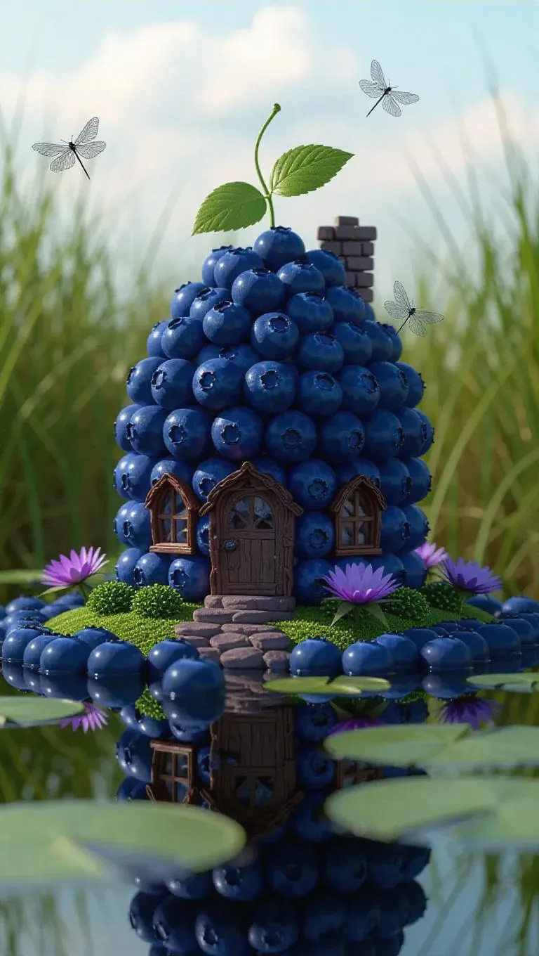 A whimsical little cottage crafted from plump blueberries and sweet icing, nestled in the heart of a serene lakeside, surrounded by a sea of lush green reeds and delicate dragonflies, exuding a sweet, enchanting aroma.