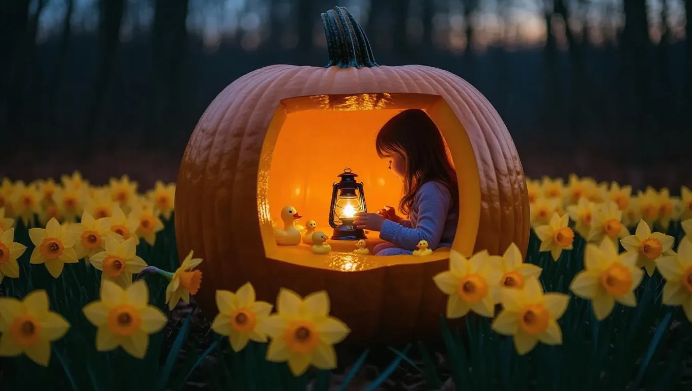 A cozy cabin crafted from a halved butternut squash, nestled among vibrant daffodil bushes. Inside, a girl plays with rubber ducks, the warm glow of a small lantern casting a gentle light, creating a serene and enchanting atmosphere.