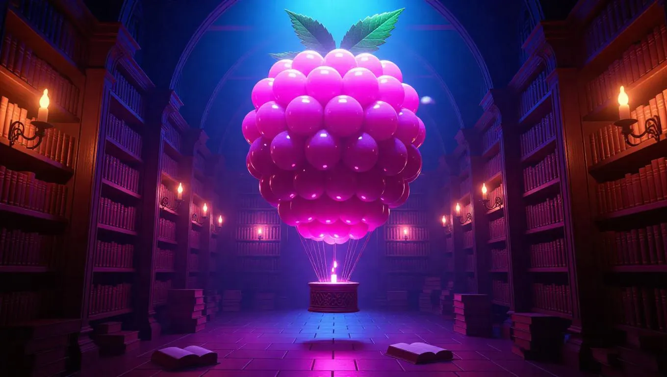 A mystical balloon nestled beneath a towering raspberry core, illuminated by glowing fruit scrolls that radiate a gentle, soothing light. Adventurous bookworms sip enchanted nectar from the scrolls, creating a whimsical and enchanting atmosphere. The walls are lined with ancient scrolls and elegant carvings, enhancing the magical ambiance.