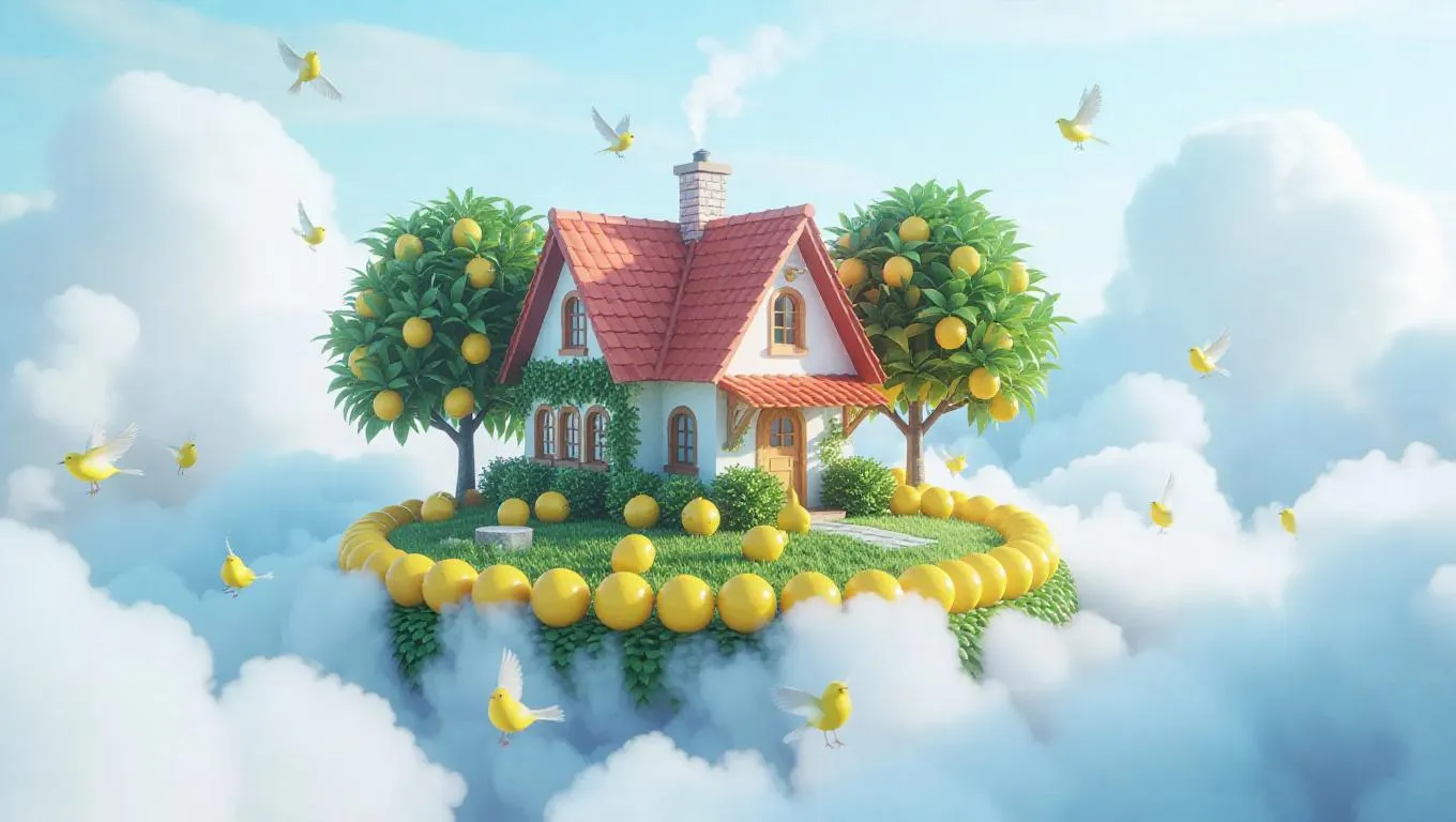 A tranquil cottage nestled in ethereal clouds, encircled by organic fruit rings and lemon birds serenading with gentle lullabies, creating a whimsical and serene atmosphere