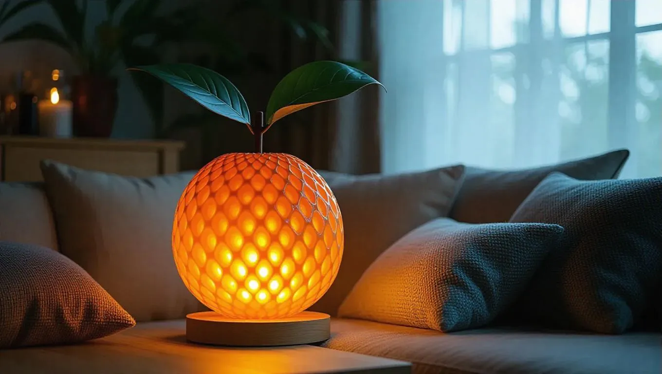 A whimsical lamp shaped like a glowing lychee, casting a warm, ambient light in a cozy corner, surrounded by minimal cushions and soft textiles, creating a serene and inviting atmosphere.