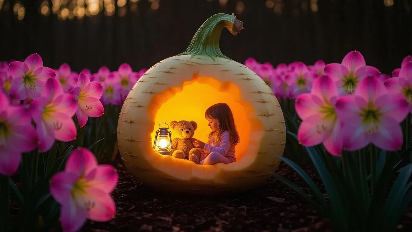 A cozy cabin crafted from a halved rutabaga, nestled among vibrant amaryllis bushes. Inside, a girl plays with a teddy bear, the warm glow of a small lantern casting a gentle light, creating a serene and enchanting atmosphere.