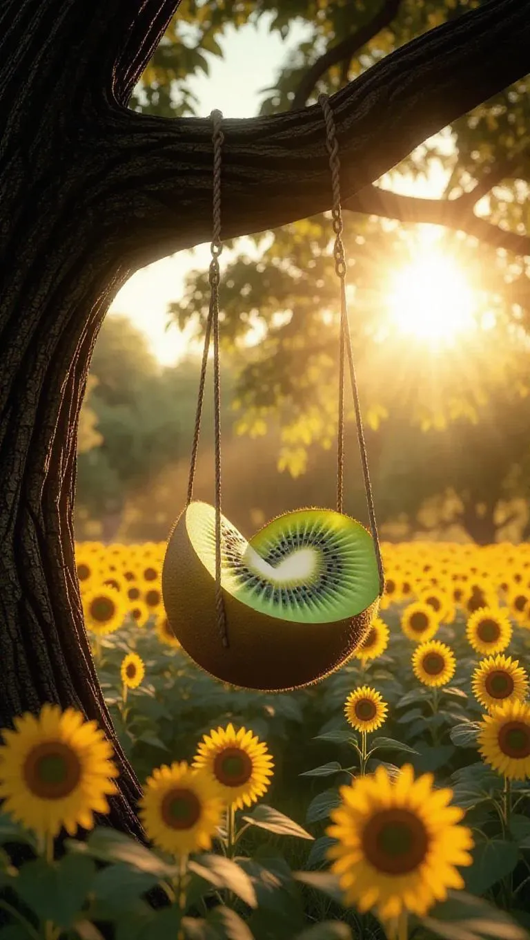 A whimsical half-kiwi-shaped swing hanging from a gnarled pine tree, surrounded by a vibrant field of sunflowers in full bloom, creating a magical and serene atmosphere, with golden sunlight filtering through the branches, casting dappled shadows.