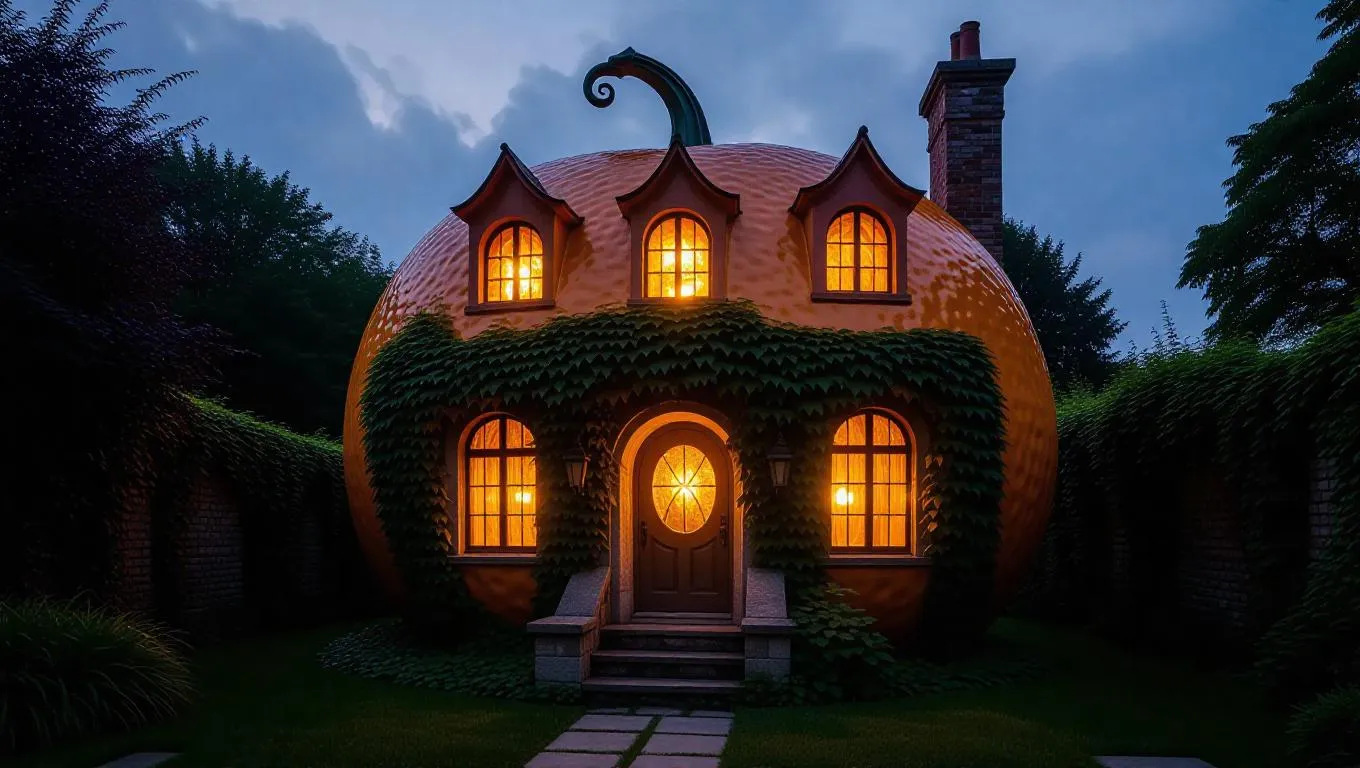 A whimsical house intricately carved from a giant orange, windows glowing softly at dusk, surrounded by an ivy-covered ruin, with shadows dancing and a whispering breeze adding to the mysterious ambiance