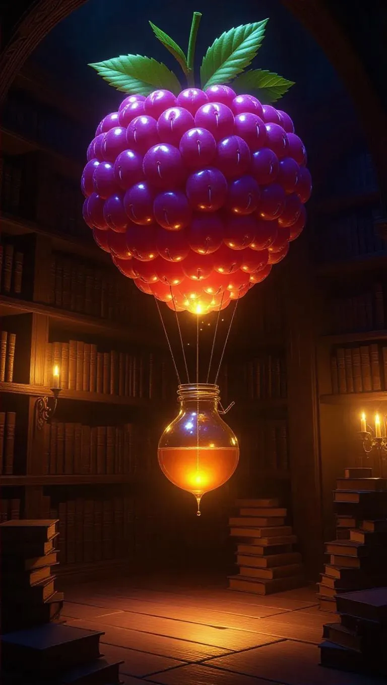 A mystical balloon hovering by a massive raspberry core, illuminated by glowing fruit scrolls that radiate a soft, celestial light. Curious bookworms sip honey from the scrolls, creating a whimsical and enchanting atmosphere. The walls are lined with ancient tomes and detailed carvings, enhancing the magical ambiance.