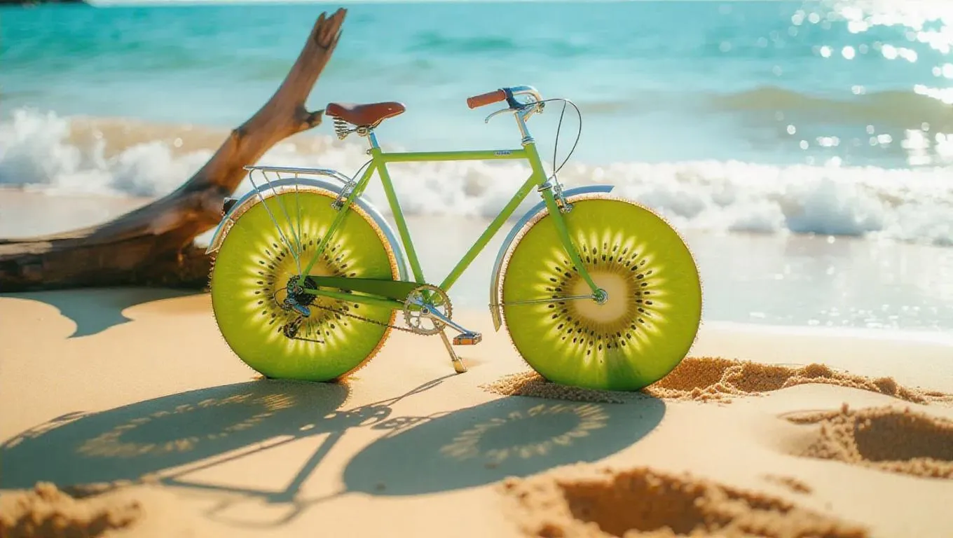 A whimsical bicycle with wheels shaped like juicy kiwi slices, standing on a sandy beach, surrounded by calm waves and driftwood, casting a playful shadow on the yellow sand, exuding a sense of summer joy and creativity.