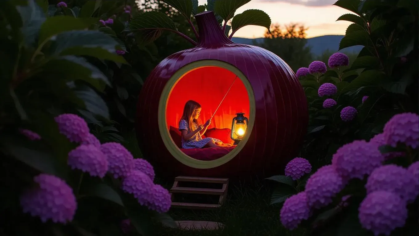 A cozy cabin crafted from a halved beet, nestled among vibrant hydrangea bushes. Inside, a girl plays with a jump rope, the warm glow of a small lantern casting a gentle light, creating a serene and enchanting atmosphere.