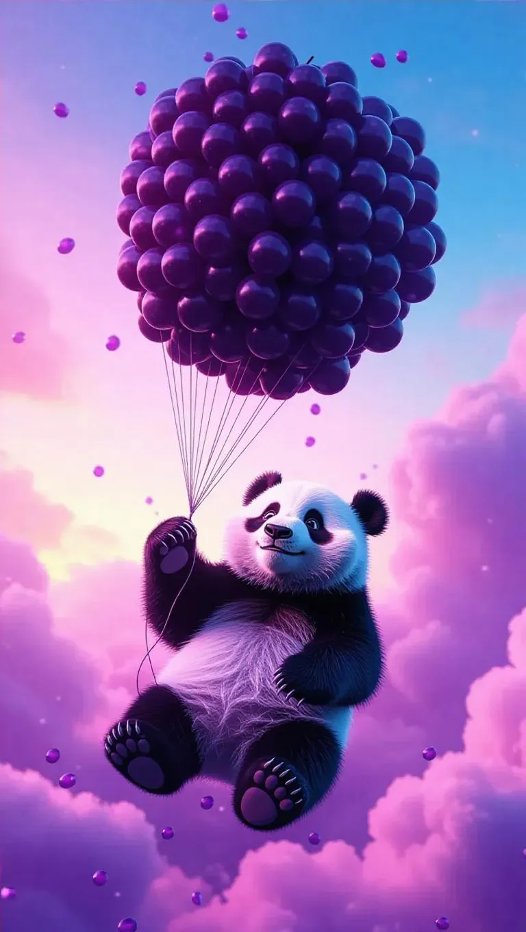 A playful panda piloting a whimsical balloon crafted from tangled grapes, soaring through vibrant pastel clouds, with a trail of grape juice glistening in the twilight, creating a magical and surreal atmosphere.
