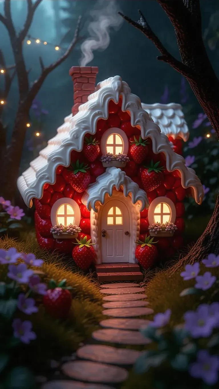 A charming strawberry house with intricate white chocolate trim, nestled in a shadowy twilight forest, surrounded by soft violet and silver flora, with a rustic wooden path leading to the front door, creating a whimsical and mysterious atmosphere.
