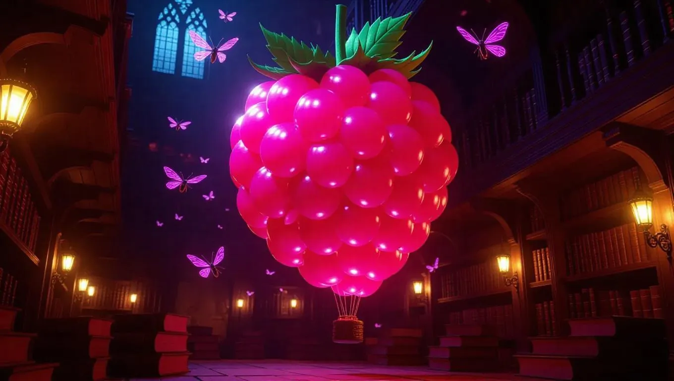 A mystical balloon nestled within a colossal raspberry core, illuminated by glowing fruit scrolls that emit a soft, ethereal light. Flying insects sip nectar from the scrolls, creating a whimsical and enchanting atmosphere. The walls are lined with ancient tomes and glowing carvings, enhancing the magical ambiance.