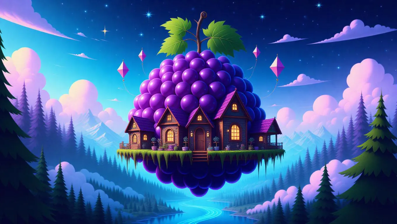 A whimsical floating library shaped like a giant grape, adorned with tiny kite-shaped houses and rivers flowing with vibrant juice, suspended under a starry night sky, with fluffy.
