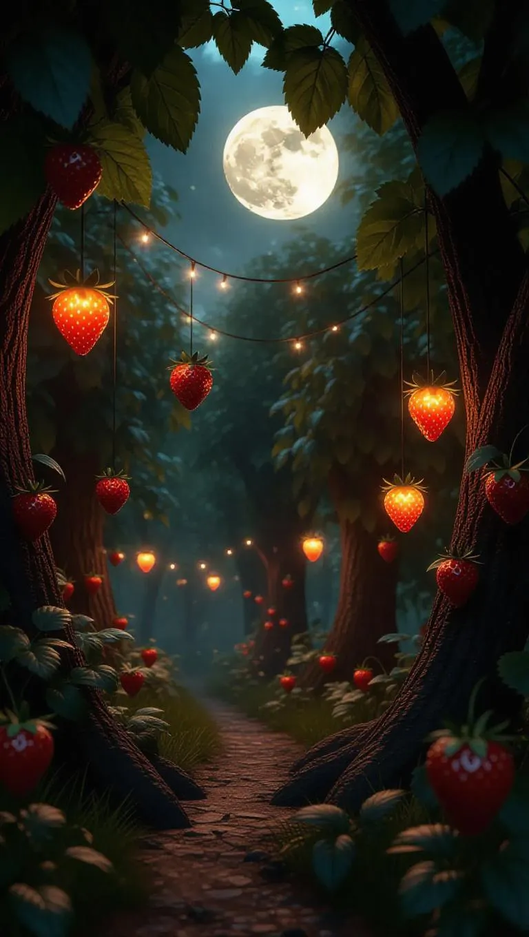 An enchanting world where trees grow upside-down, strawberries hanging like glowing lanterns, casting a soft, warm light. The forest is lit by a radiant moon, and the air is filled with a calm, serene aroma. Twinkling fireflies dance around the strawberry-lanterns, adding a magical touch to the scene.