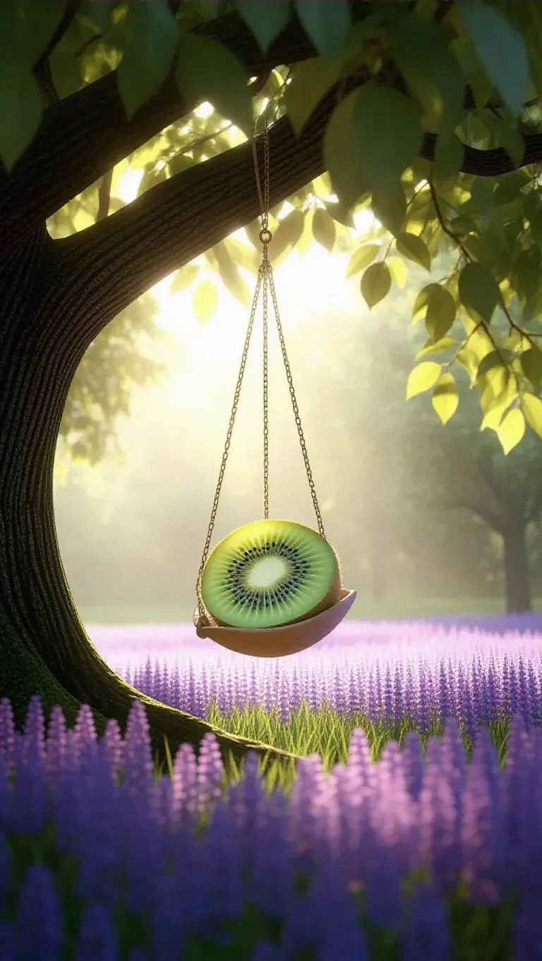 A whimsical half-kiwi-shaped swing hanging from a friendly sycamore tree, surrounded by a vibrant meadow of violets and lilacs in full bloom, creating a magical and serene atmosphere, with gentle sunlight dappling through the leaves, casting dappled shadows.