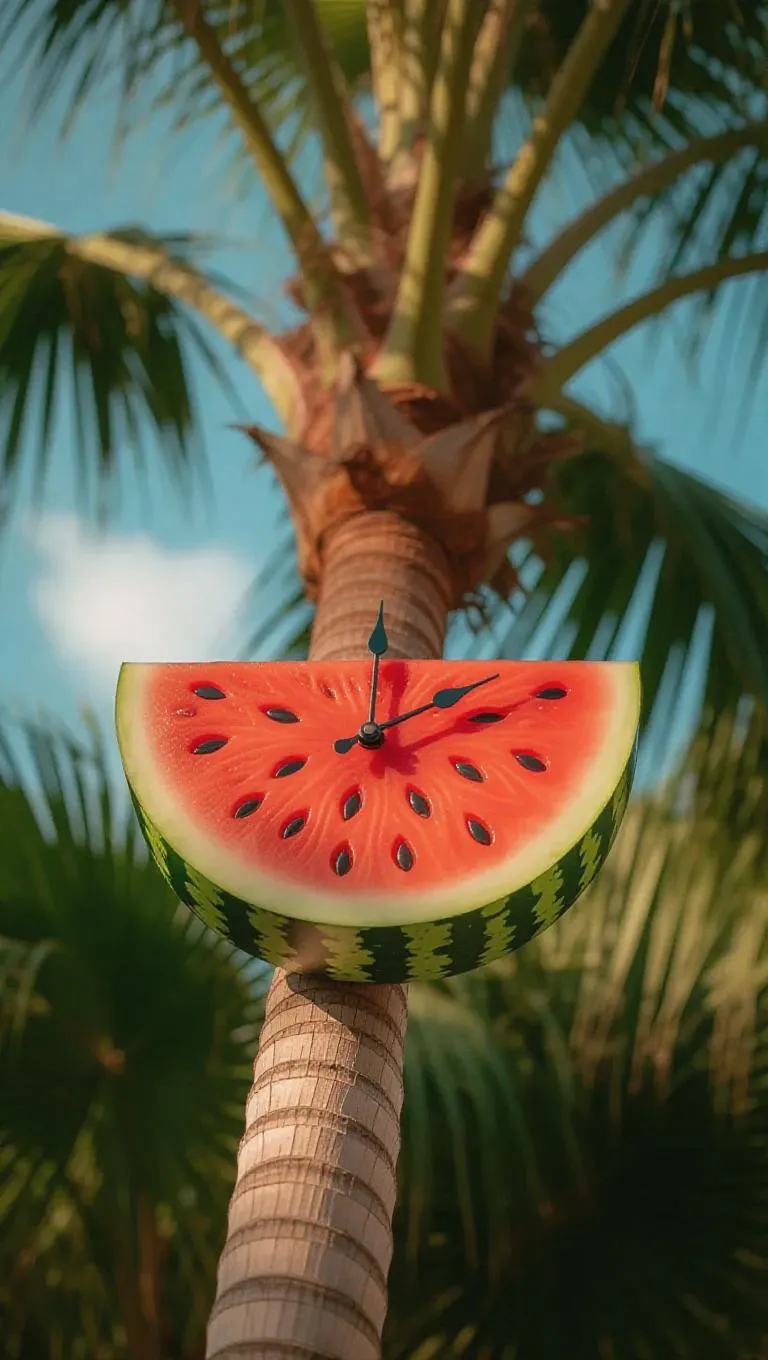 A whimsical clock shaped like a half watermelon, with seed-shaped hour markers, resting on a tropical palm tree backdrop, exuding a warm and inviting summer vibe.