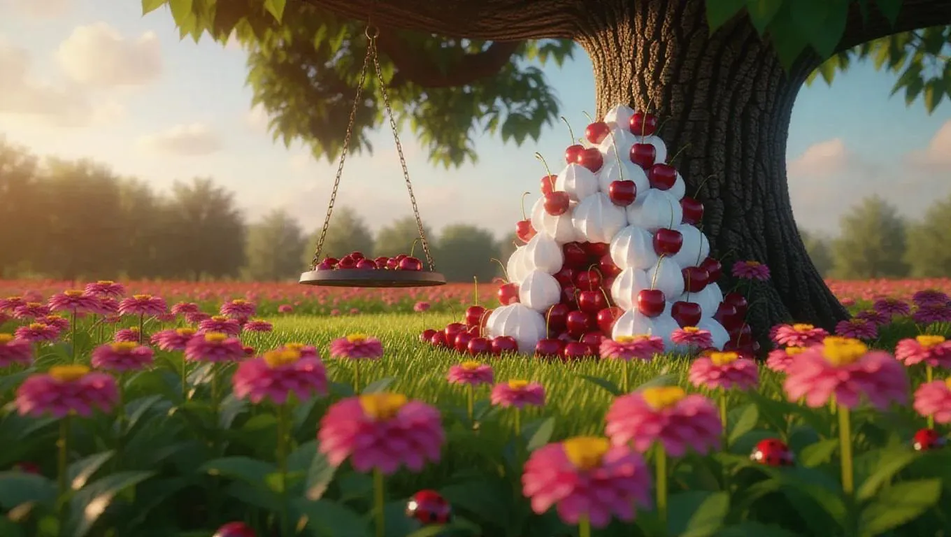 A whimsical little fortress crafted from sweet cherries and fluffy meringue, nestled in the heart of a colorful zinnia field, surrounded by a sea of blooming zinnias and playful ladybugs, with a tire swing hanging from a sturdy chestnut tree, exuding a sweet, enchanting aroma under the warm afternoon sun.