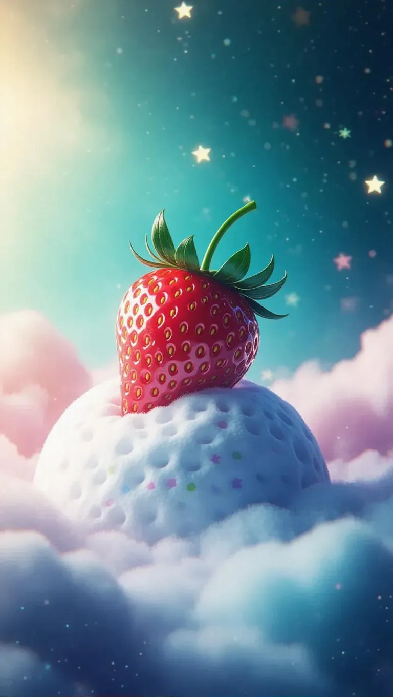 A whimsical strawberry-shaped spaceship gently landing on a fluffy, marshmallow moon, surrounded by a sprinkle of colorful stars, with a soft, pastel sky creating a dreamy, otherworldly atmosphere.