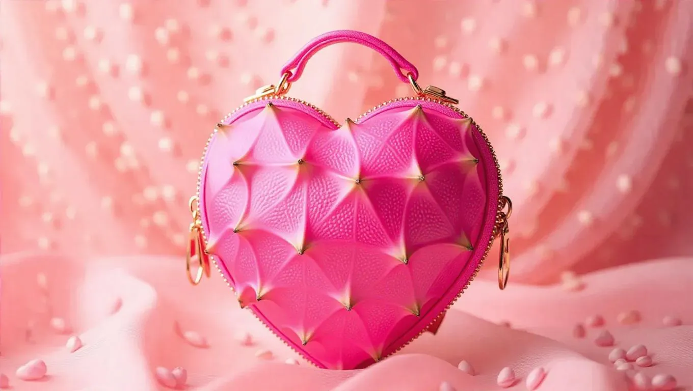 A heart-shaped dragonfruit handbag with golden zippers and a tiny seed charm, exuding a whimsical charm, set against a pastel pink backdrop, with delicate seed patterns and soft, dreamy lighting.