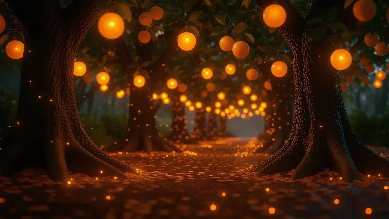 n enchanting world where trees grow upside-down, oranges hanging like glowing lanterns, casting a soft, warm light. The forest floor is carpeted with golden petals, and the air is filled with a sweet, citrus aroma. Twinkling fireflies dance around the orange-lanterns, adding a magical touch to the scene.