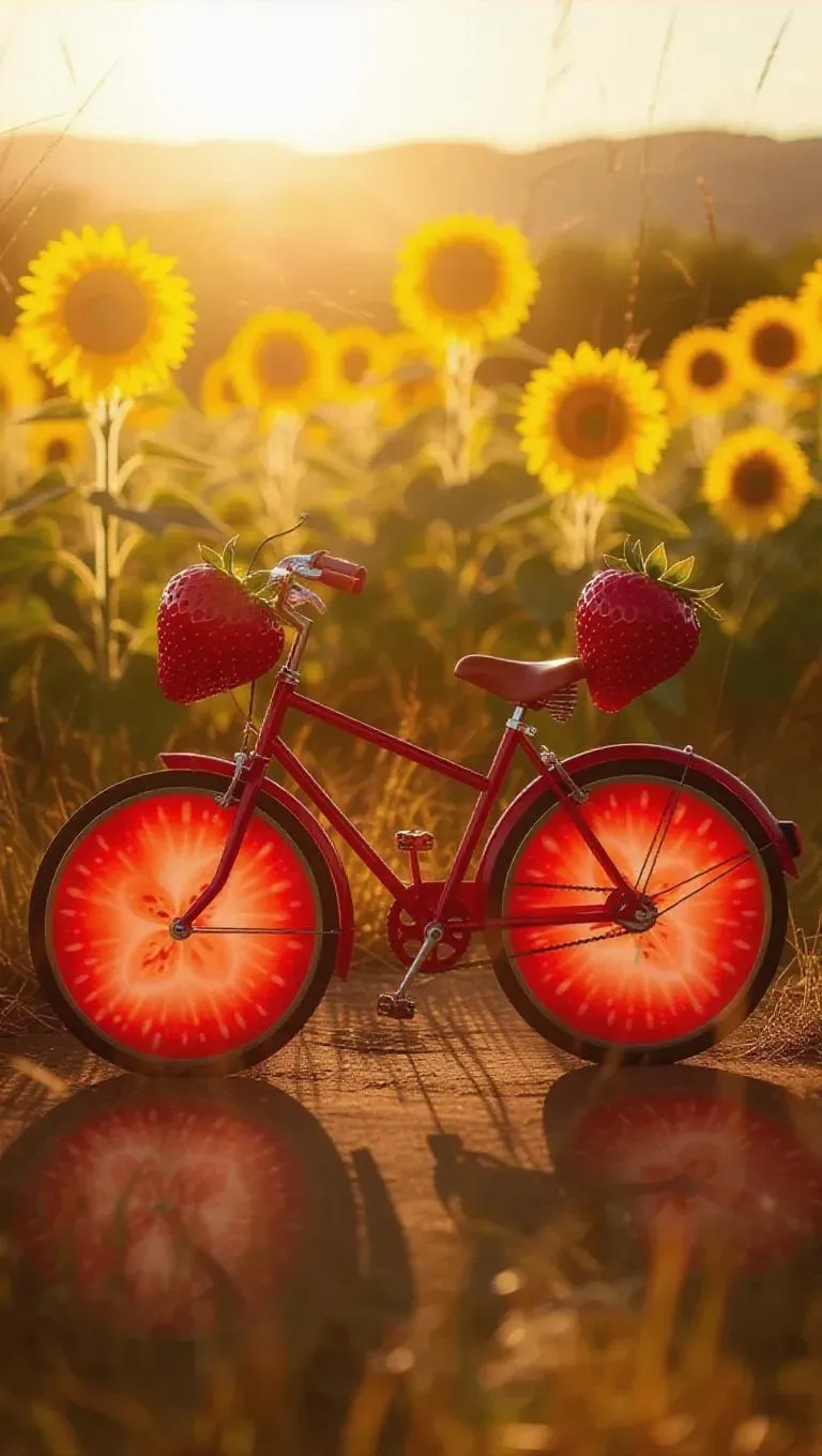 A whimsical bicycle with wheels shaped like sweet strawberry halves, standing in a sunny meadow, surrounded by bright sunflowers and tall swaying grass, casting a playful shadow on the golden ground, exuding a sense of summer joy and creativity.