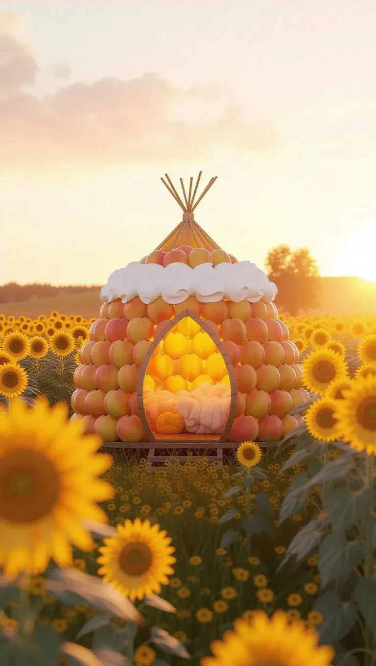 A whimsical little yurt crafted from golden peaches and fluffy whipped cream, nestled in the heart of a serene sunflower field, surrounded by a sea of bright yellow sunflowers and soft green grass, exuding a sweet, enchanting aroma under the gentle evening glow.
