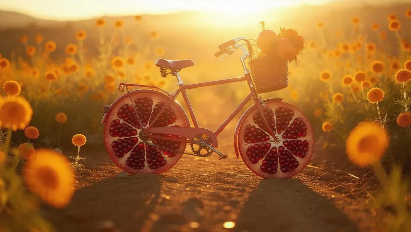 A whimsical bicycle with wheels shaped like tangy pomegranate sections, standing in a sunny meadow, surrounded by cheerful marigolds and tall swaying grass, casting a playful shadow on the golden ground, exuding a sense of summer joy and creativity.