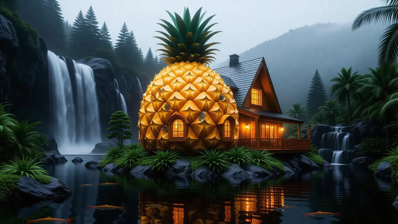 A pineapple-shaped house surrounded by waterfalls, its golden yellow exterior and spiky green crown glistening in the mist, windows glowing warmly as rainbow trout swim below, creating a surreal and enchanting scene.