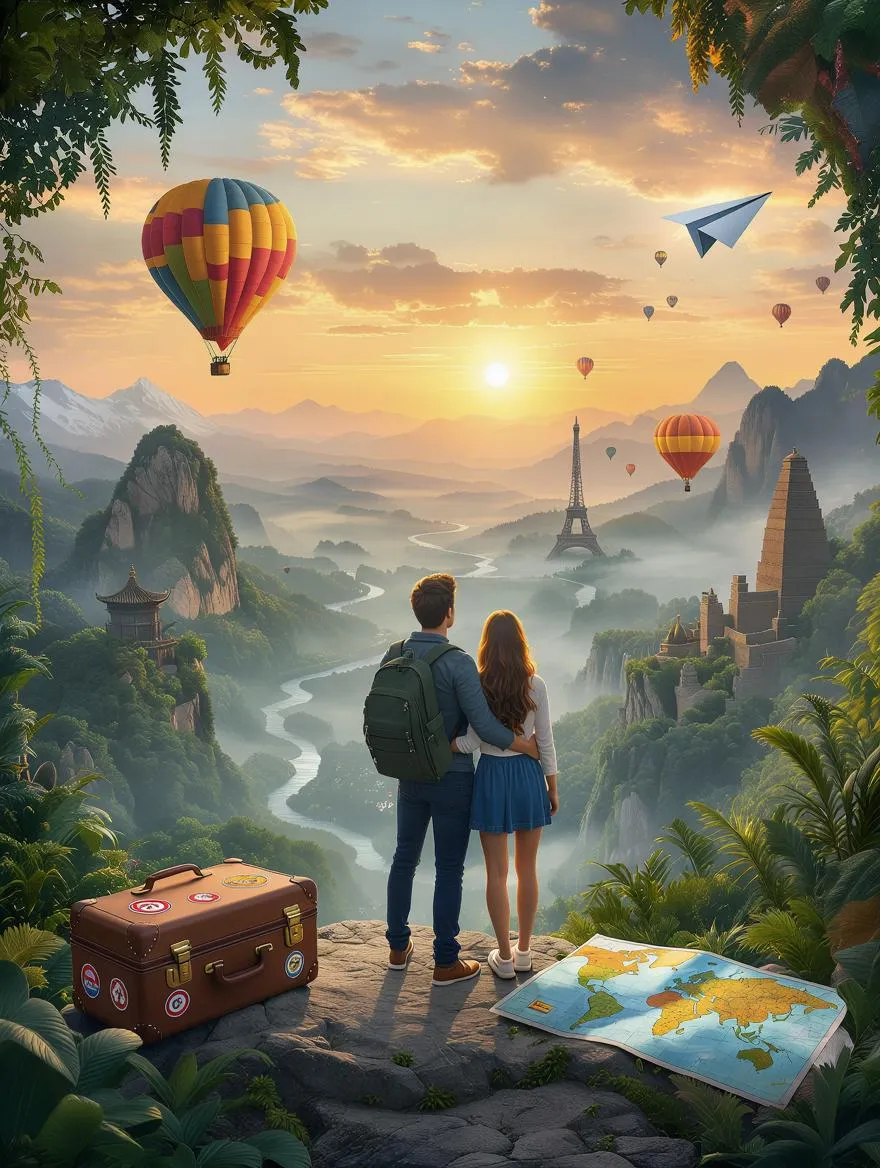 A breathtaking, dreamlike travel illustration with a young couple standing on a cliff at sunrise, overlooking a misty valley adorned with vibrant hot air balloons, winding rivers, and ancient ruins veiled in jungle vines. The couple is framed against a glowing horizon, embodying awe and wanderlust. Symbolic travel elements—vintage suitcase with stickers, a world map unfurled on a rock, and a paper airplane soaring in the sky—surround them. Distant snow-capped mountains, tropical beaches, and iconic global landmarks like the Eiffel Tower, Great Wall of China, and Machu Picchu subtly merge into the landscape, creating an inspiring, magical atmosphere. Hyper-realistic details and painterly lighting.