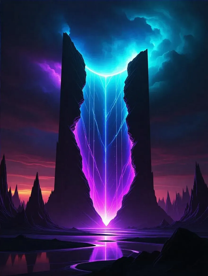 In a surreal landscape, a colossal dimensional crack spans a twilight sky, emitting an eerie, iridescent glow. The crack shimmers with pulsating energy, warping the environment around it. The atmosphere is charged with unease and intrigue. The art style blends surrealism with cosmic elements, invoking a profound sense of wonder and enigma.