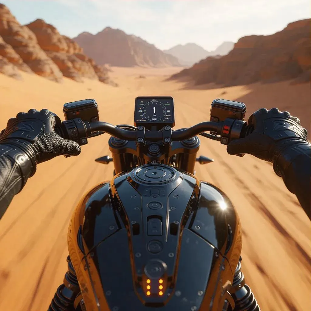 AI-generated sci-fi art of a futuristic motorcycle racing through desert dunes. Experience adrenaline-pumping speed with detailed high-tech controls, glowing displays, and matte-black metallic design. First-person perspective captures advanced cockpit tech and rugged terrain. Perfect for sci-fi enthusiasts seeking dynamic desert adventure visuals. Create your own AI-powered sci-fi vehicle scenes with text prompts.