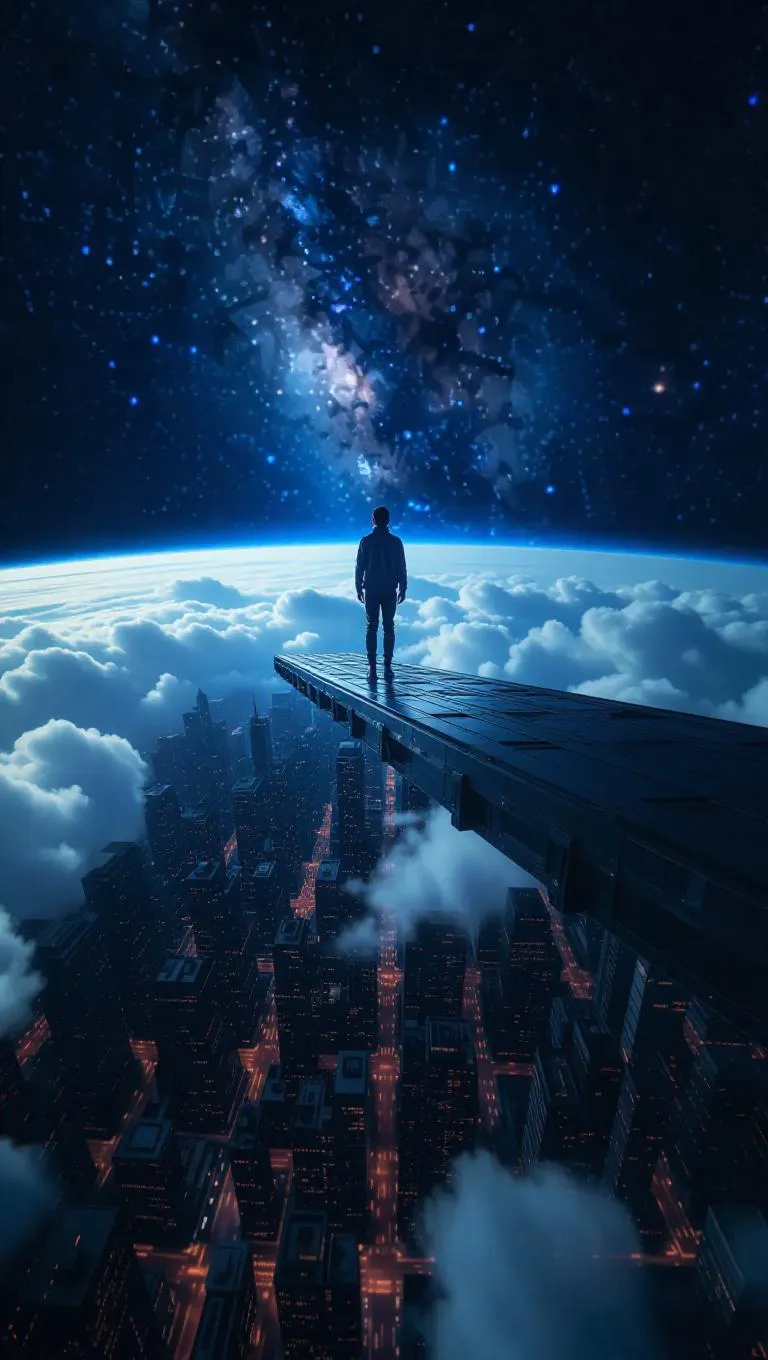 Cloud City 100km above ground. Very high above ground, stars and universes and outer space in background. Young person on super sky scrapping cloud City edge dramatically dangling legs Looking over edge to see earth below from cloud City. Very distinct and elevated city realistic. Booming and busy never sleeping city on the clouds