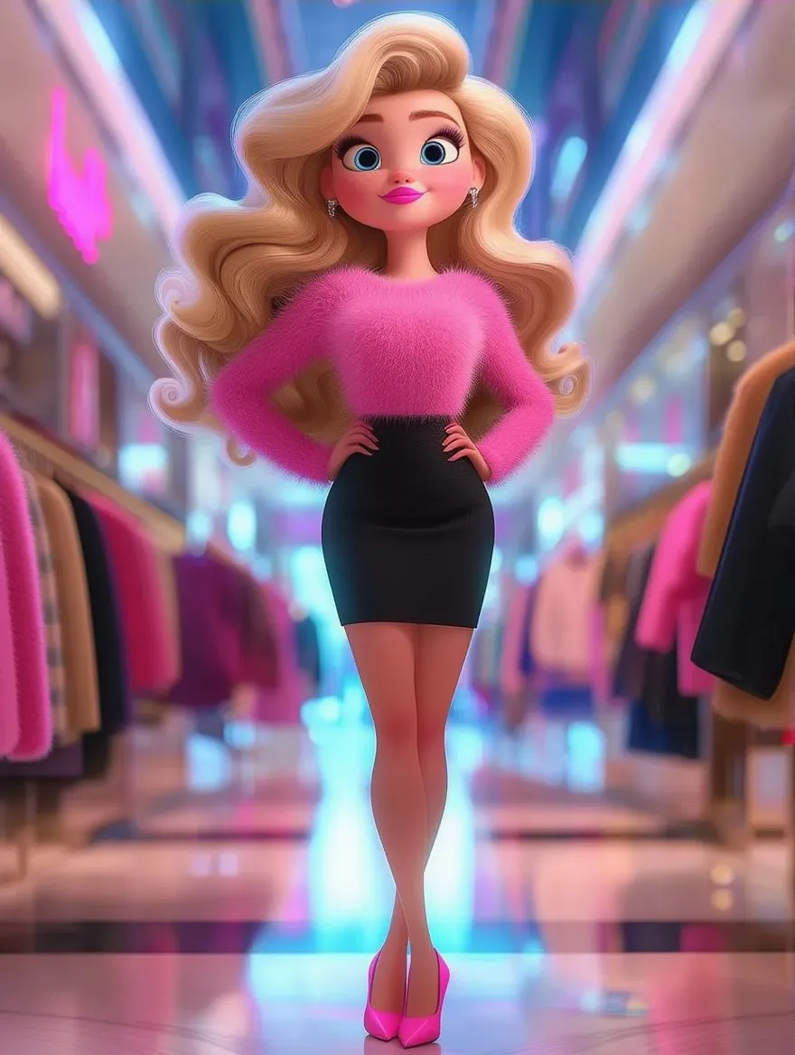 Generate a Pixar-style AI character: cute blonde woman with wavy hair, pink lips, fuzzy sweater, pencil skirt, and pumps in a department store. Create vivid, hyper-clear 3D animations using AI image generation. Perfect for stylized character design with exaggerated curves. #Pixar effects, professional-grade visuals.