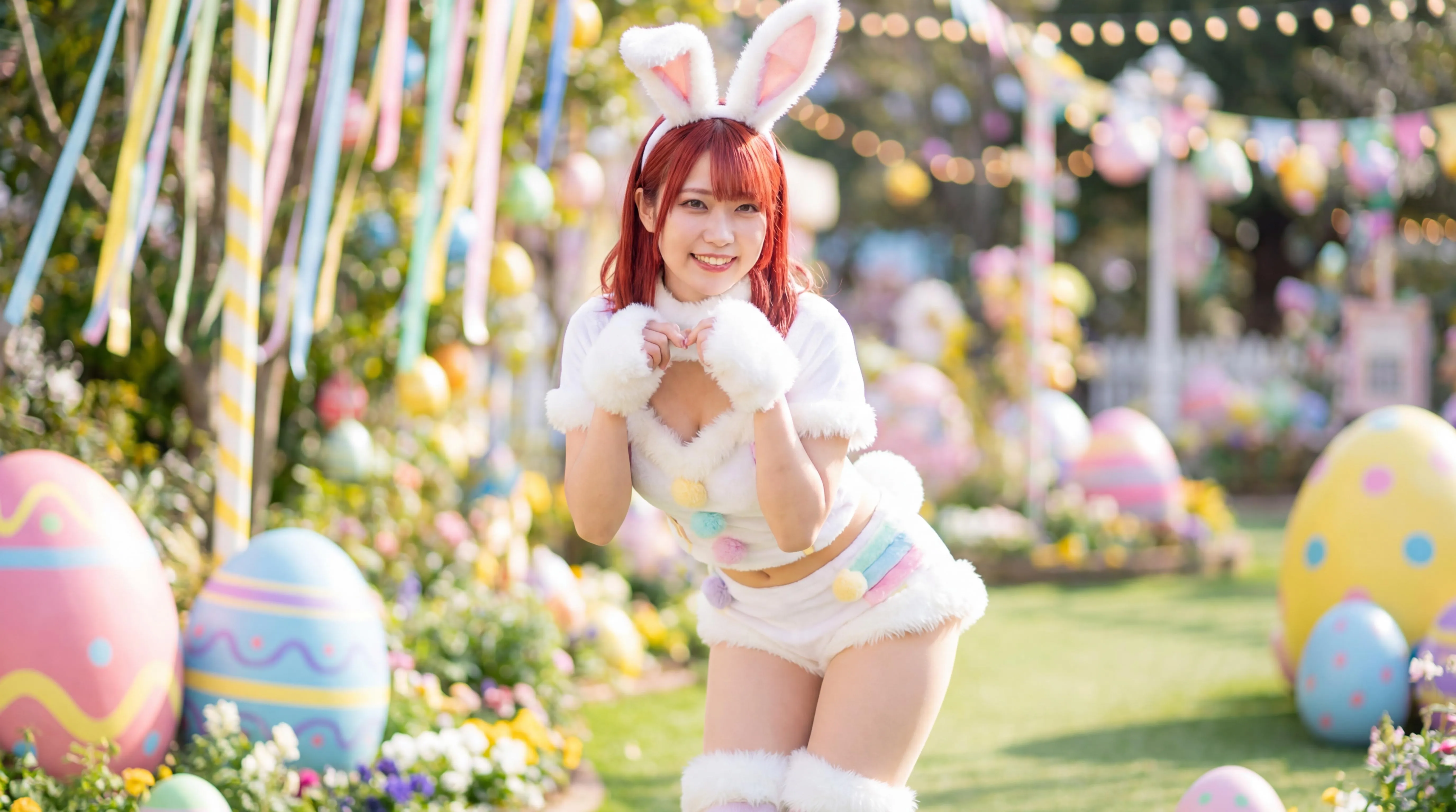 Full-body image of a hot, very beautiful, very slim red-haired Japanese woman with ample breasts in a skimpy, provocative, skin-tight Easter bunny macrokinis made of white fur with a plunging neckline, bright colors, playful bunny ears, sparkling eyes, and a mischievous smile in front of a colorful, festive, lascivious Easter background with no other