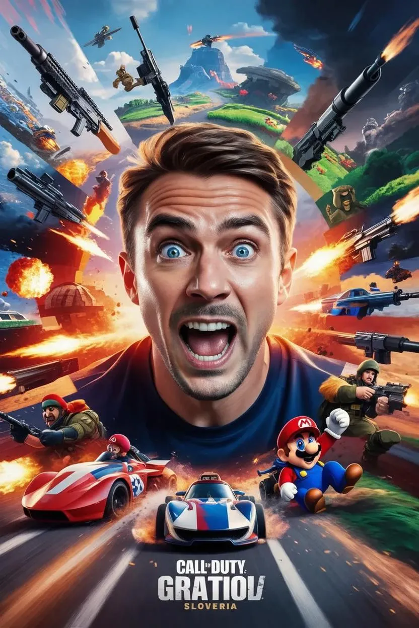 Create a vibrant AI-generated portrait capturing a surprised Slovenian man amidst a dynamic gaming universe. Experience high-speed racing, pixel-art explosions, military battlegrounds, pirate adventures, and heroic fantasy realms seamlessly merged into a multidimensional spectacle. Perfect for gaming enthusiasts seeking immersive, AI-crafted visuals with professional-grade detail and creativity.