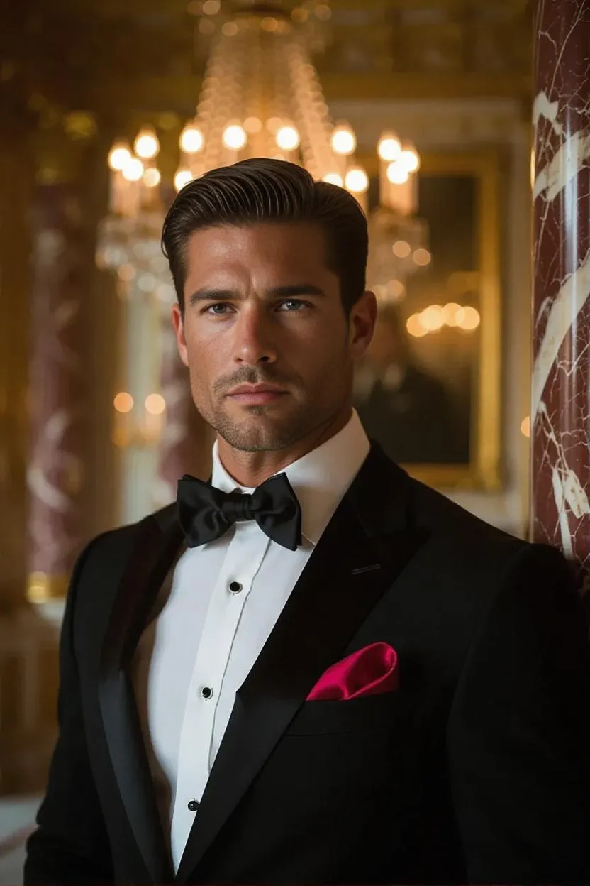 Create a sophisticated AI-generated magazine cover with a chiseled-jawline model in a tailored black tuxedo and crimson silk pocket square. Set against luxurious marble walls and an elegant chandelier backdrop, this timeless design combines classic aesthetics with AI precision. Transform your vision into professional-grade visuals using VivaGo's advanced image generation tools.