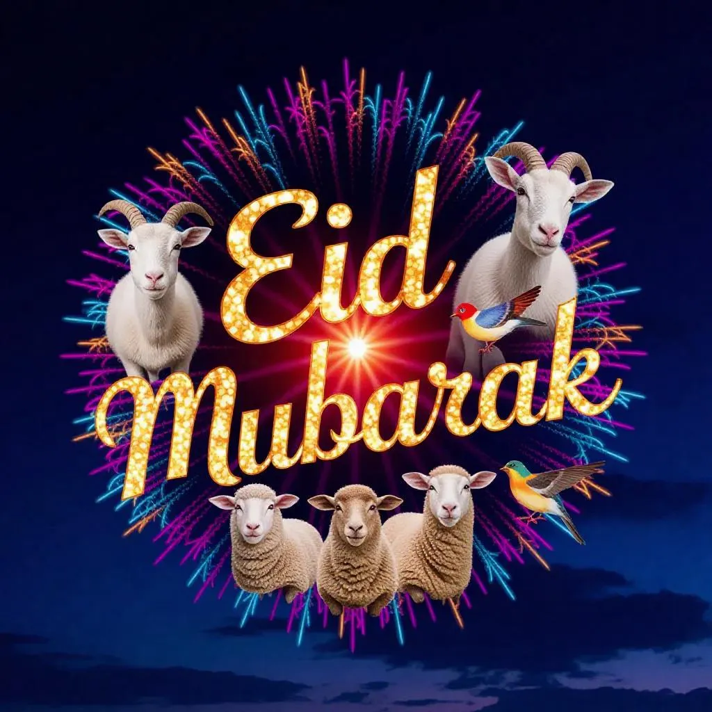 Create vibrant AI-generated Eid Mubarak greetings with dazzling fireworks, festive animals, and a photorealistic goat. Elevate celebrations using AI tools for dynamic visuals, authentic details, and shareable content that captures Eid's joyous spirit.