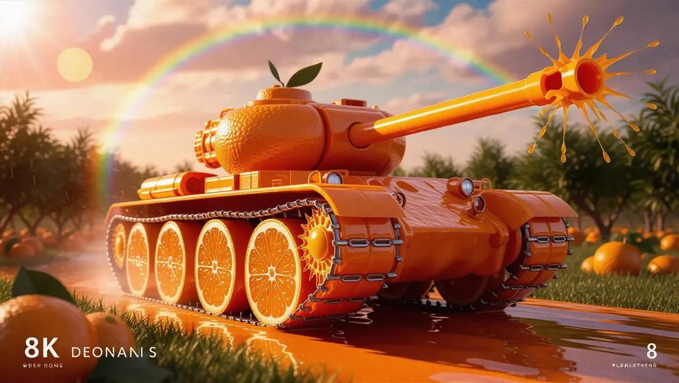 A whimsical, hyper-detailed illustration of a citrus-powered battle tank with a body crafted from glossy mandarin orange segments, rolling on sliced orange wheels oozing fresh juice. A giant bendy straw turret rotates atop, firing concentrated citrus jets that create rainbow refractions in sunlight. Sun-kissed citrus grove battlefield backdrop with lens flares accentuating the tank's glossy citrus armor. Dynamic low-angle view emphasizing the tank's imposing fruity silhouette against golden hour skies, rendered in 8K resolution with vibrant color saturation and intricate juice droplet details.