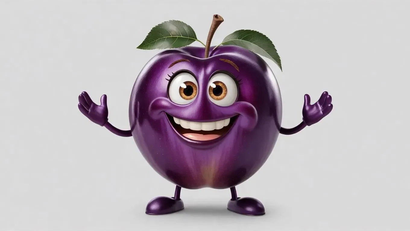 Create a whimsical cartoonish plum character with vibrant purple hues, large expressive eyes, and a playful smile using AI image generation. Design flexible limbs, shiny textures, and lively poses for animations, stickers, or children's content. Perfect for friendly, animated visuals with vivago.ai's creative tools.