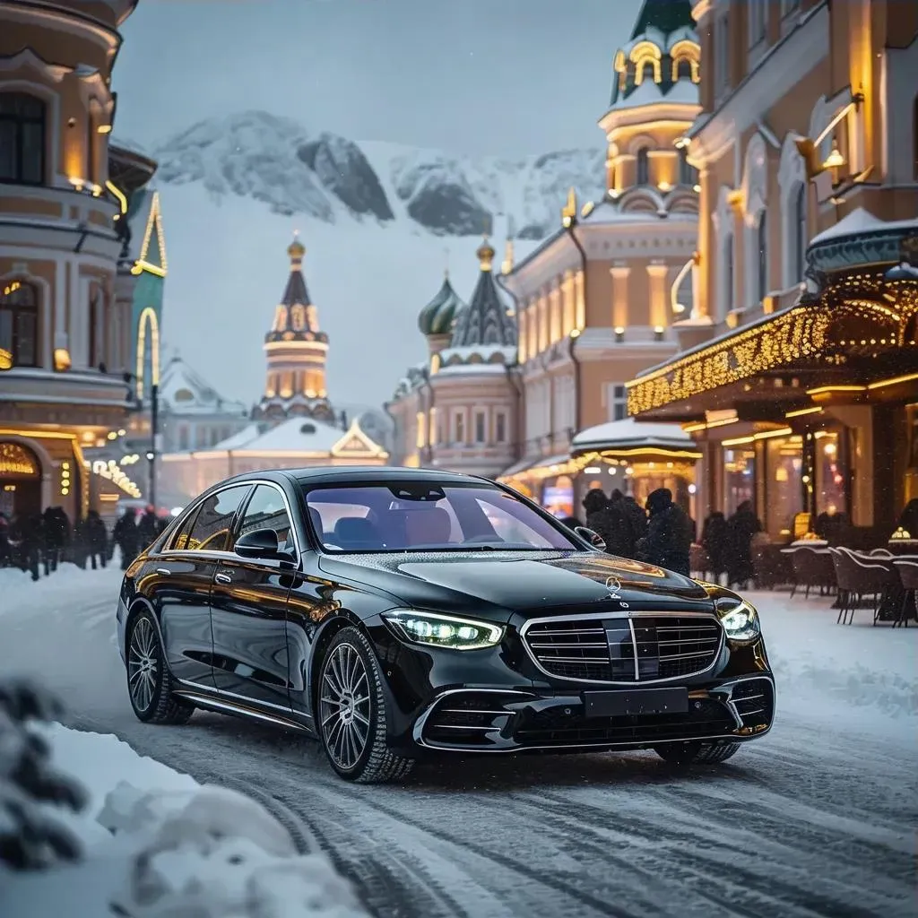 Generate stunning AI art of a luxury black Mercedes-Benz S-Class gliding through a snowy Nordic cityscape toward a glowing Arctic casino. Explore vivid AI effects for icy blues, white lights, and cozy gamblers sipping cocoa—craft professional visuals with VivaGo's AI image generator.