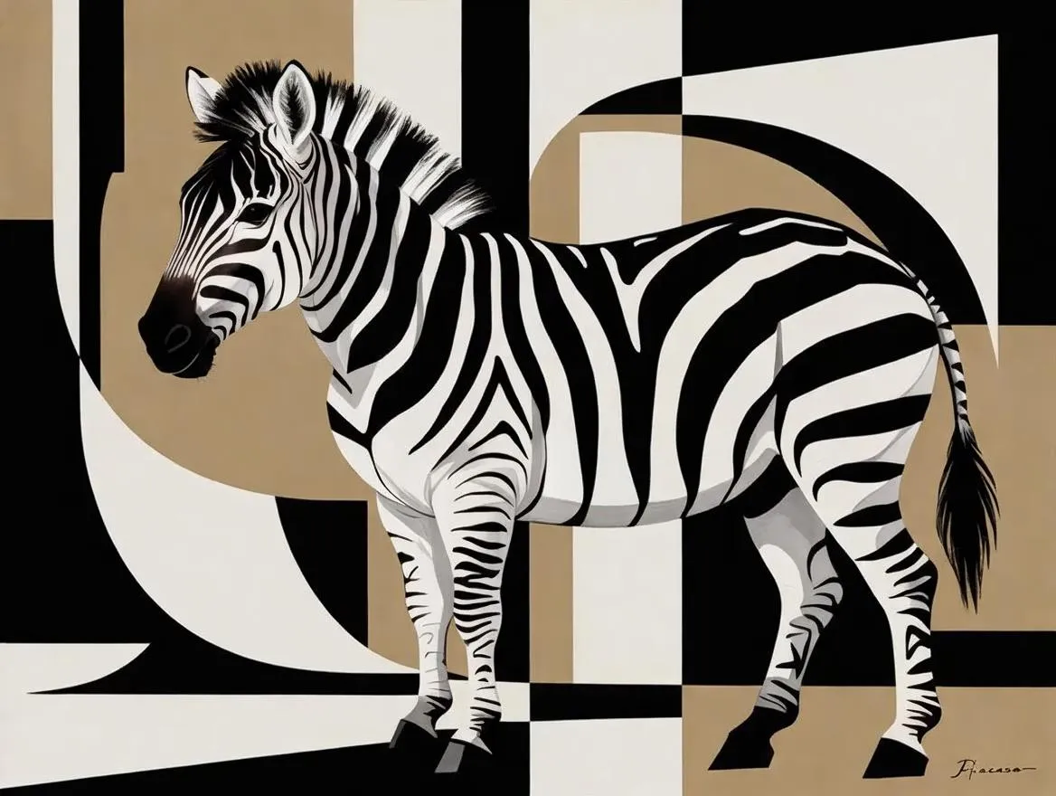Create a Picasso-inspired cubist zebra with vivago.ai. Geometric black and white stripes fragment into angular shapes, showcasing abstract multi-perspective forms. Minimal background highlights bold contrasts and avant-garde distortion. Elevate AI art generation with professional cubism effects for striking, modern visual content.