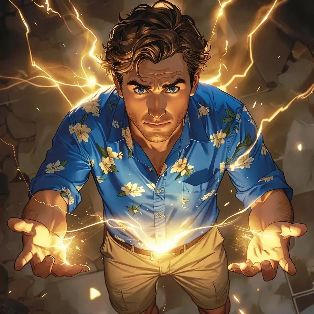 Create surreal AI-generated visuals of a man glowing with radiant golden energy, clothes obscured by intense light. Top view captures confusion and dynamic transformation. Perfect for AI art, video effects, and magical realism themes. Ideal for AI-powered image generation tools seeking vivid, ethereal character designs.