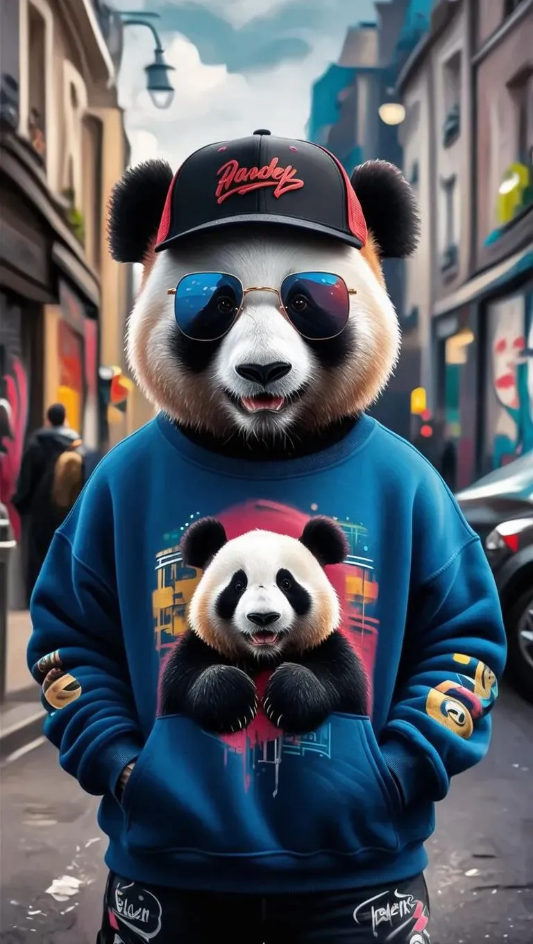 Create a vibrant AI-generated anthropomorphic panda in streetwear: backwards cap, flashy sunglasses, and graffiti-patterned oversized sweatshirt. Perfect for urban art, character design, or edgy visuals. Explore vivago.ai’s AI image tools to craft dynamic, stylish anthropomorphic characters with graffiti art effects and creative editing features.